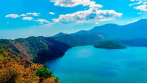 El lago de Coatepeque, es uno de los lugares turísticos más hermosos que puedes visitar en El Salvador. Cuenta con una gran extensión en la que puedes practicar varios deportes, además de su belleza cuenta con una excelente vista panorámica hacia el volcán de santa Ana y el cerro verde.